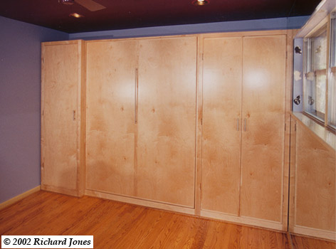 Built-in cabinet of plywood and American white oak, finished with sprayed tinted lacquer, pigment stain and clear lacquer. Built in the workshop and test assembled prior to delivery and installation at the client's residence.