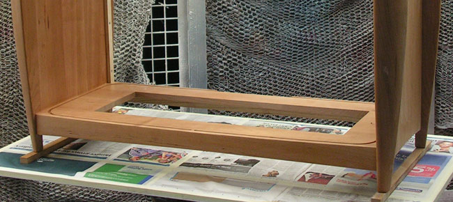 this specific cabinet. All that remains to do is to remove the screwed on bead from the locking stave, slip the tambour into its groove at the back of the cabinet, and push the tambour around to a convenient spot. Next, working from the back of the cabinet, the locking stave is reattached to the rest of the tambour by refitting the bead and trapping the canvas, and the canvas cut flush with the back of the locking stave to leave a clean finish on the inside. ![]() The last small job is creating and fitting stops to prevent the tambour opening too far, and in this case, four small T profiled maple blocks were fashioned and screwed into place. The lower leg of the T profile fits into the tambour groove, and is simply a means of eliminating the very small chance of the blocks rotating in use. They are held in place with a single screw making them easy to remove and replace if the tambour assembly requires maintenance of some sort in the future. ![]() ![]() Home Biography Tables, Chairs Cabinet Furniture Beds, Built-ins, Other Work Exhibitions, Galleries, News Articles Teaching and Student Work Contact © 2017 Richard Jones |