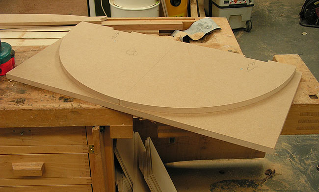 between the laminations in the foreground go to the table's top side. ![]() Below. Sitting on top of the grooved MDF is the half elliptical foot template used